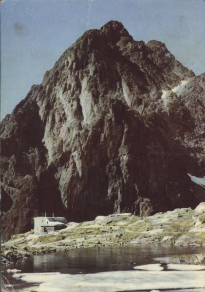 Schronisko Téryego w w Dolinie Małej Zimnej Wody. Na pierwszym planie Pośredni Staw Spiski. W tle Pośrednia Grań i Żółty Szczyt.