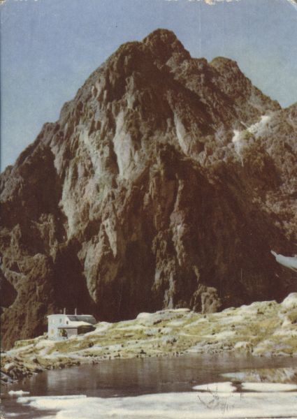 Schronisko Téryego w w Dolinie Małej Zimnej Wody. Na pierwszym planie Pośredni Staw Spiski. W tle Pośrednia Grań i Żółty Szczyt.