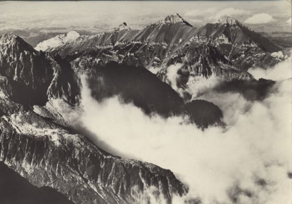 Widok z Łomnicy na wschodni± czę¶ć Tatr Wysokich otoczon± chmurami i szczyty Tatr Bielskich, od lewej: Murań, Nowy Wierch, Hawrań i Płaczliwa Skała.