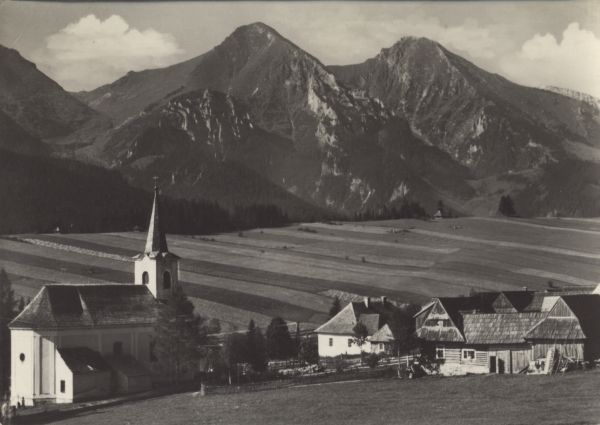 Widok na Zdziar. Na pierwszym planie ko¶ciół i zabudowania wiejskie. W tle Płaczliwa Skała i Hawrań.