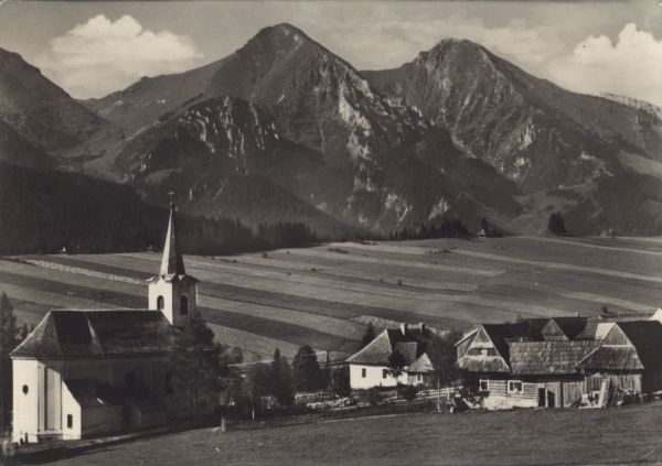 Widok na Zdziar. Na pierwszym planie ko¶ciół i zabudowania wiejskie. W tle Płaczliwa Skała i Hawrań.