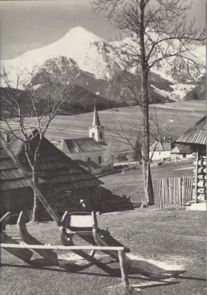 Widok na zabudowania wiejskie i kościół. Na pierwszym planie płozy od sań. W tle ośnieżone wierzchołki Płaczliwej Skały i Hawrańa.