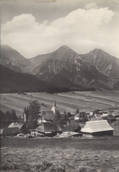 Widok na Zdziar. Na pierwszym planie zabudowania wiejskie i ko¶ciół. W tle Płaczliwa Skała i Hawrań.