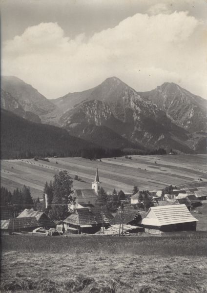 Widok na Zdziar. Na pierwszym planie zabudowania wiejskie i ko¶ciół. W tle Płaczliwa Skała i Hawrań.