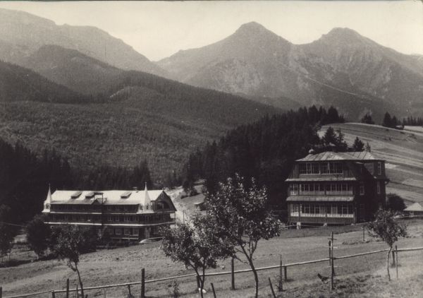 Budynek związkowego domu wypoczynkowego Tatra w miejscowości Zdziar i jego otoczenie. Po prawej stronie pensjonat Protežka. W tle szczyty Tatr Bielskich: Płaczliwa Skała i Hawrań.