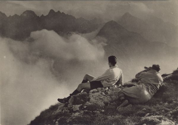 Widok z Tatr Bielskich na Tatry Wysokie. W tle Łomnica, Durny Szczyt i Jagnięcy Szczyt (z przodu). Na pierwszym planie 2 turystów.