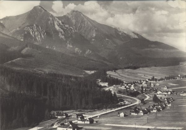 Widok na Zdziar. Na pierwszym planie zabudowania wiejskie, w głębi las. W tle Płaczliwa Skała i Hawrań.