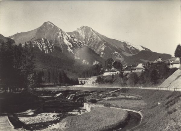 Widok z miejscowości Zdziar na Tatry Bielskie: Hawrań i Płaczliwą Skałę. Na pierwszym planie Potok Bielski. Po prawej stronie zabudowania wiejskie.