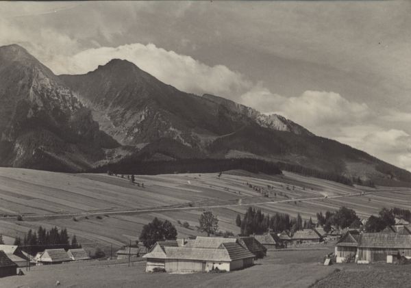 Widok z miejscowo¶ci Zdziar na Tatry Bielskie: Hawrań i Płaczliw± Skałę. Na pierwszym planie zabudowania wiejskie. W głębi pola uprawne.