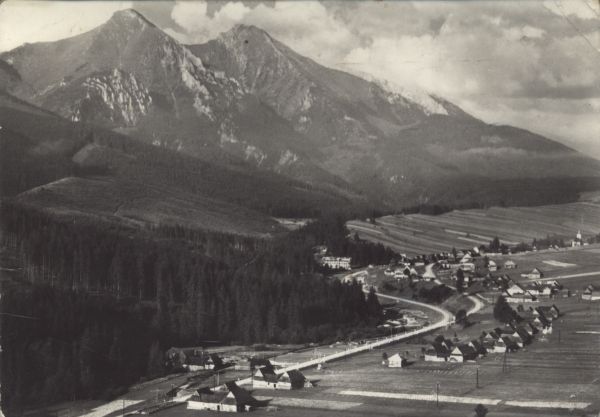 Widok na Zdziar. Na pierwszym planie zabudowania wiejskie, w głębi las. W tle Płaczliwa Skała i Hawrań.