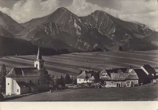 Widok na Zdziar. Na pierwszym planie ko¶ciół i zabudowania wiejskie. W tle Płaczliwa Skała i Hawrań.
