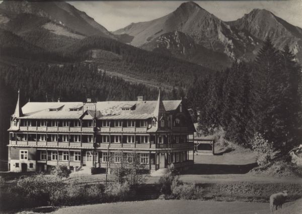 Budynek związkowego domu wypoczynkowego Tatra w miejscowości Zdziar i jego otoczenie. W prawym dolnym rogu owca, w głębi las. W tle szczyty Tatr Bielskich: Płaczliwa Skała i Hawrań.