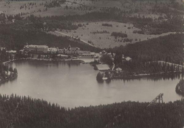 Widok na Szczyrbskie Jezioro. Na brzegu zabudowania sanatoryjno hotelowe. Po prawej stronie na dole widoczna skocznia narciarska.