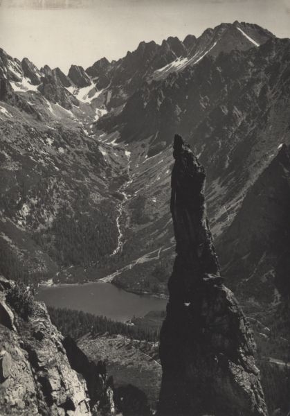 Widok na Popradzki Staw i Dolinę Złomisk. Na pierwszym planie Basztowa Igła. W tle szczyty otaczaj±ce Dolinę Złomisk, od lewej ¦nieżna Kopa, Wschodni Żelazny Szczyt, Zmarzły Szczyt i Kończysta.