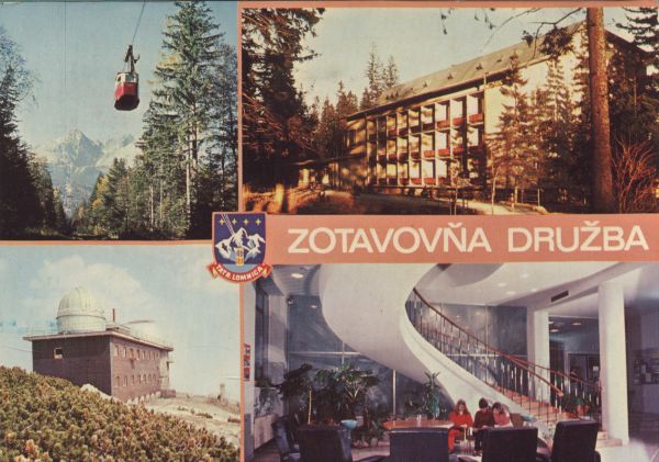 Tatry Wysokie. Tatrzańska Łomnica - Dom wypoczynkowy RZZ Družba - Wnętrze holu - Kolej linowa na Łomnicę - Obserwatorium Astronomiczne SAN przy Łomnickim Stawie.