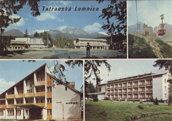 Tatranská Lomnica. VYSOKÉ TATRY - WYSOKIE TATRY - HOHE TATRA - THE HIGH TATRAS Obchodnę dom a Dom sluŸieb, v pozadí Slavkovskę čtít (2452 m), Lomnickę hrebeò, Lomnickę čtít (2632 m), KeŸmarskę čtít (2558 m) - Kabínková lanovka na Skalnaté pleso - Hotel Horec - Zotavovòa ÚSCD DruŸba