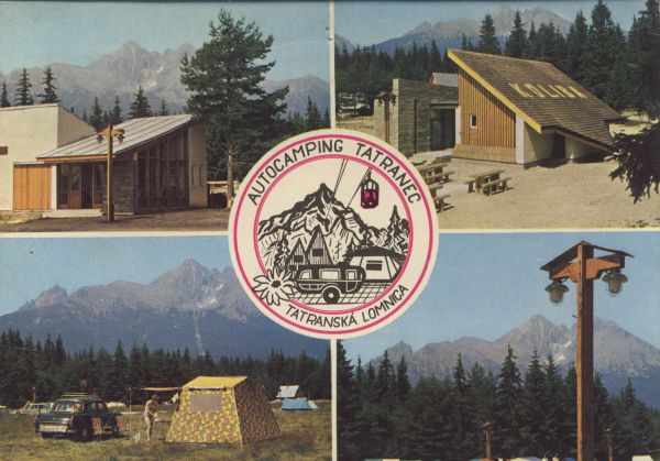 Pocztówka 4. elementowa. Na kolejnych zdjęciach przedstawiono: Autokemping Tatranec w Tatrzańskiej Łomnicy