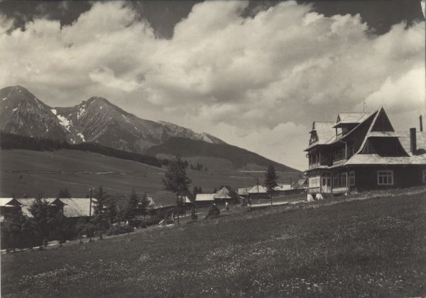 Zabudowania miejscowo¶ci Zdziar w Tatrach Bielskich. W tle pejzaż Tatr Bielskich: Płaczliwa Skała i Hawrań.