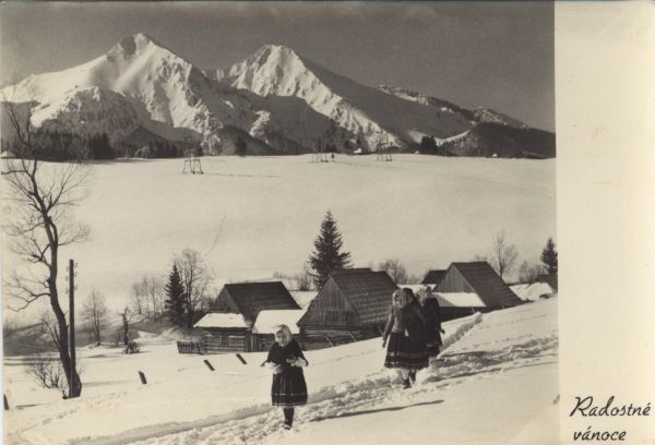 Zimowy widok na Tatry Bielskie ze Zdziaru. Na pierwszym planie 5 dziewczynek, za nimi drewniane domy i drzewa. W tle Płaczliwa Skała i Hawrań. Obok fotografii życzenia świąteczne: Radostné vánoce.
