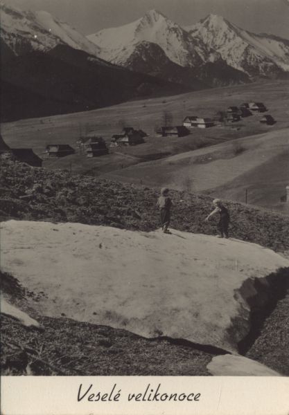 Na pierwszym planie dwoje dzieci bawi się na płacie śniegu. W głębi zabudowania osady. W tle ośnieżone szczyty Tatr Bielskich: Hawrań i Murań. Pod zdjęciem życzenia: Veselé velikonoce.