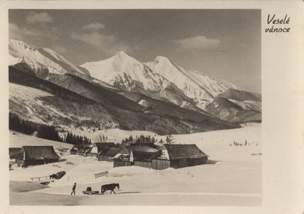 Na pierwszym planie sanie ciągnięta przez konia. W głębi zabudowania w Zdziarzew zimowej scenerii. W tle Płaczliwa Skała i Hawrań.