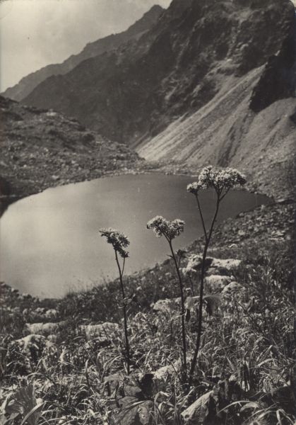 Widok z góry na Mały Staw Hińczowy w Dolinie Mięguszowwieckiej. Na pierwszym planie miłosna górska (Adenostyles alliariae).