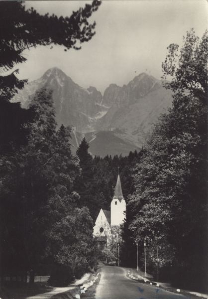 Na pierwszym planie droga w miejscowości Tatrzańska Łomnica. W głębi kościół ewangelicki. W tle wznosi się Łomnica.