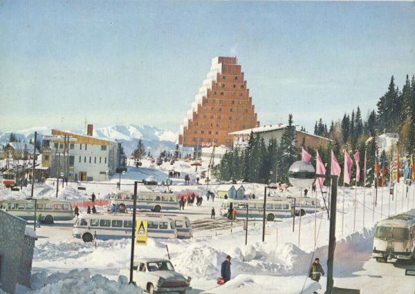 Widok na hotel Panorama w scenerii zimowej. Na pierwszym planie parking dla autobusów.