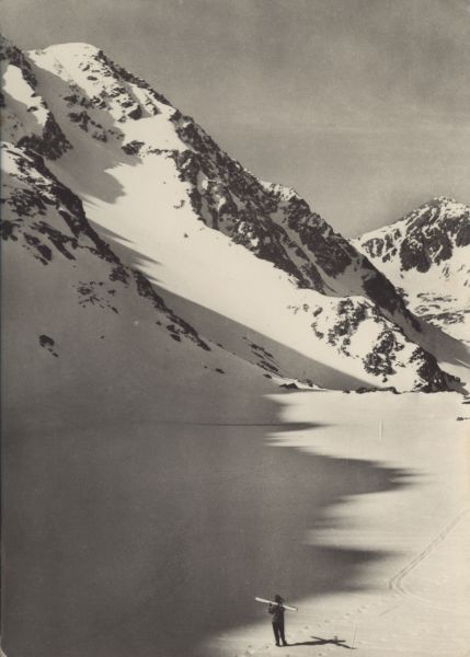 Wyżni Staw Rohacki zimą. Z lewej Trzy Kopy. Na stawie ślady nart i stojący narciarz.
