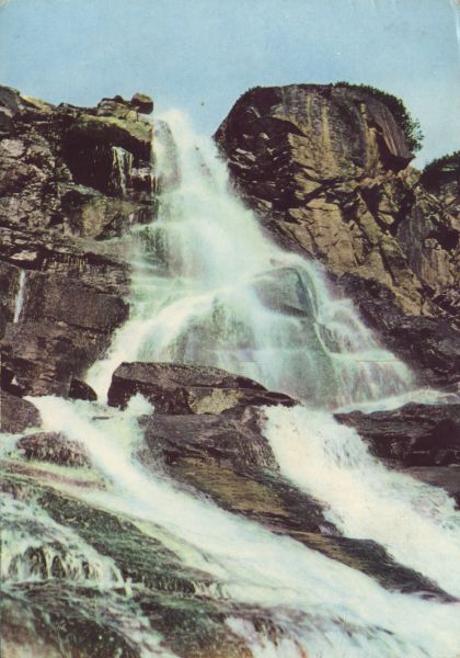 Tatry Wysokie - Wodospad Skok w Dolinie Młynickiej. Tytuł również w języku: ros., niem., ang.