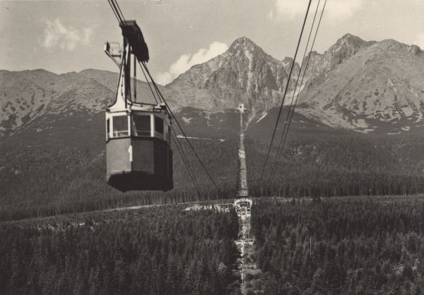 Tatry Wysokie - kolej linowa na Łomnicę pod ni± kotlina Łomnickiego Stawu. [Błędny opis, wagonik kolei linowej znajduje się nad Wielkim Lasem na południe od Tatrzańskiej Łomnicy]