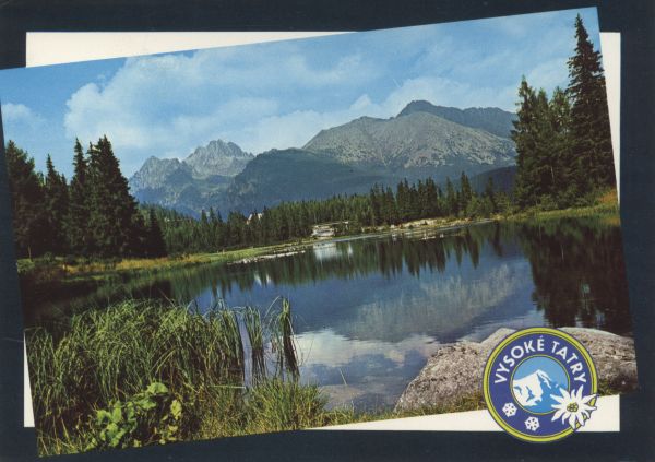 Widok znad Nowego Szczyrbskiego Jeziora na panoramę Wysokiej i Kończystej. W dolnym prawym rogu logo miasta: VYSOKÉ TATRY.