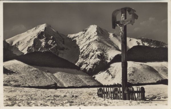 Zdziar w zimie. Przydrożny krzyż. W tle Tatry Bielskie z Płaczliw± Skała i Hawraniem.