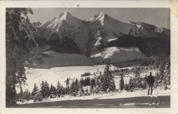 Widok na grań Tatr Bielskich zim±. Od lewej: Płaczliwa Skała, Hawrań i Murań. Na pierwszym planie narciarz.