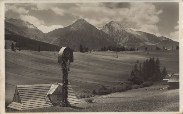 Zdziar. Widoczne zabudowania wiejskie i przydrożny krzyż. W tle Tatry Bielskie z Płaczliw± Skała i Hawraniem.