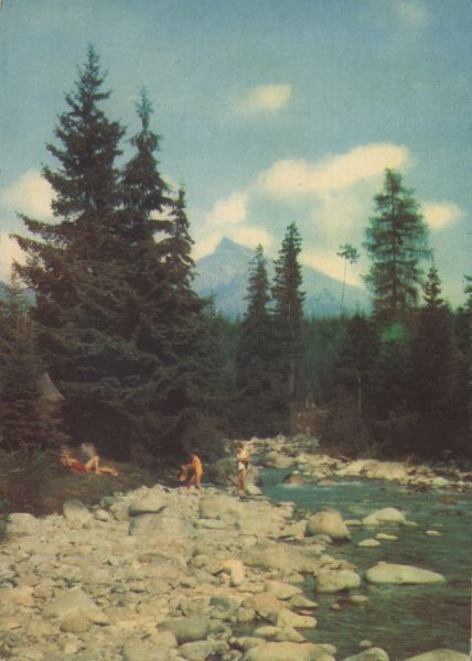 Turyści wypoczywający nad rzeką Biała Liptowska. Wokół las. W tle Krywań.