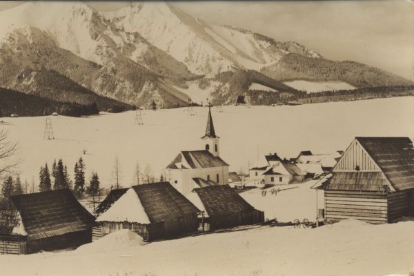 Zdziar w zimie. Widoczne zabudowania wiejskie i kościół. W tle Płaczliwa Skała i Hawrań.