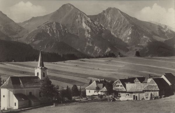 Zdziar. Widoczne zabudowania wiejskie i kościół. W tle Płaczliwa Skała i Hawrań.