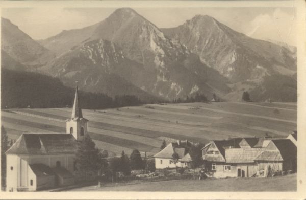 Zdziar. Widoczne zabudowania wiejskie i ko¶ciół. W tle Płaczliwa Skała i Hawrań.