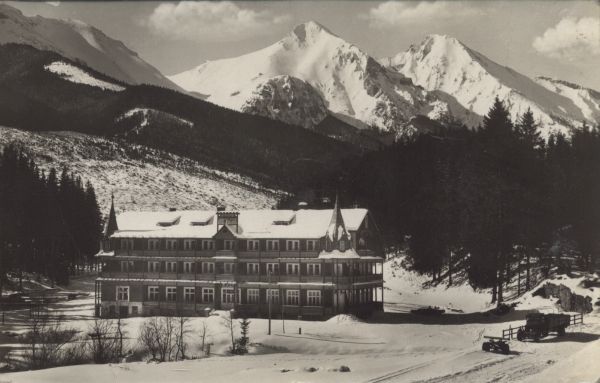 Zdziar w zimie. Związkowy Dom Wypoczynkowy Tatra. W tle Płaczliwa Skała i Hawrań.