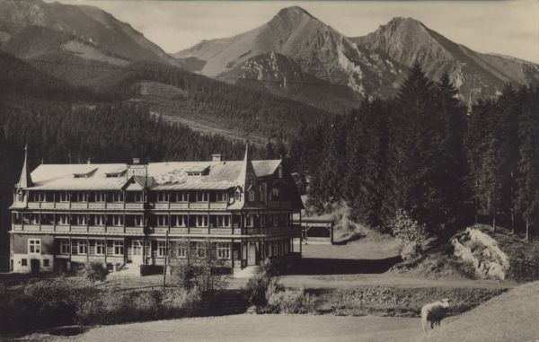 Zdziar. Związkowy Dom Wypoczynkowy Tatra. W tle Płaczliwa Skała i Hawrań. Na pierwszym planie owca.