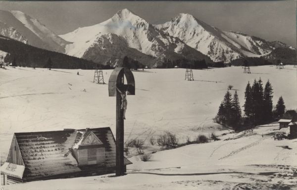 Zima w Zdziarze. Widoczne zabudowania wiejskie i przydrożny krzyż. W tle Tatry Bielskie z Płaczliw± Skała i Hawraniem.