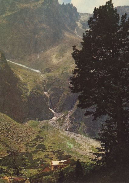 Widok na dolinę otoczenie Zielonego Stawu Kieżmarskiego. Na pierwszym planie po lewej stronie limba (Pinus cembra L.). i świerki (Picea A. Dietr.). W środku schronisko im. Alberta Brnčala przy Zielonym Stawie Kieżmarskim. W tle Dolina Dzika i spadające z niej Dzikie Siklawy.