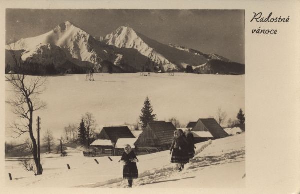 Zimowy widok na Tatry Bielskie ze Zdziaru. Na pierwszym planie 5 dziewczynek, za nimi drewniane domy i drzewa. W tle Płaczliwa Skała i Hawrań. Obok fotografii życzenia świąteczne: Radostné vánoce.