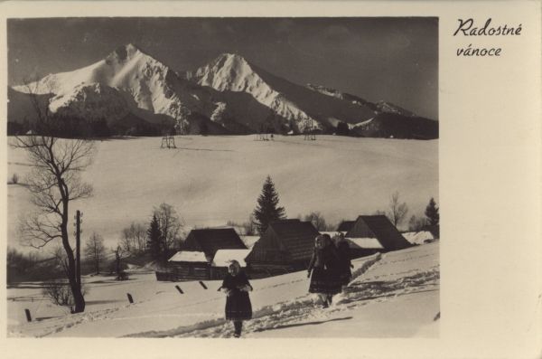 Zimowy widok na Tatry Bielskie ze Zdziaru. Na pierwszym planie 5 dziewczynek, za nimi drewniane domy i drzewa. W tle Płaczliwa Skała i Hawrań. Obok fotografii życzenia świąteczne: Radostné vánoce.