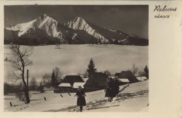 Zimowy widok na Tatry Bielskie ze Zdziaru. Na pierwszym planie 5 dziewczynek, za nimi drewniane domy i drzewa. W tle Płaczliwa Skała i Hawrań. Obok fotografii życzenia świąteczne: Radostné vánoce.
