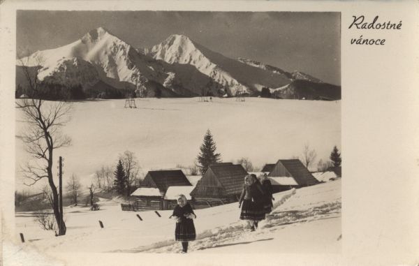 Zimowy widok na Tatry Bielskie ze Zdziaru. Na pierwszym planie 5 dziewczynek, za nimi drewniane domy i drzewa. W tle Płaczliwa Skała i Hawrań. Obok fotografii życzenia świąteczne: Radostné vánoce.