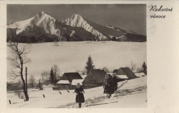Zimowy widok na Tatry Bielskie ze Zdziaru. Na pierwszym planie 5 dziewczynek, za nimi drewniane domy i drzewa. W tle Płaczliwa Skała i Hawrań. Obok fotografii życzenia świąteczne: Radostné vánoce.
