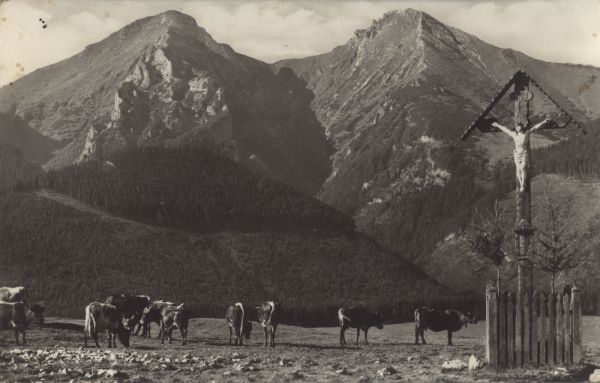 Zdziar. Przydrożny krzyż, pastwisko. W tle Tatry Bielskie z Płaczliw± Skała i Hawraniem.