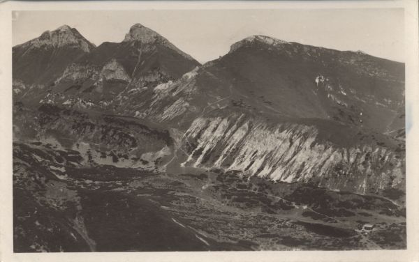 Widok z Rakuskiej Czuby na Schronisko Kieżmarskie Klubu Słowackich Turystów i Narciarzy w Dolinie Białych Stawów, Przełęcz pod Kop± i Płaczliw± Skałę.